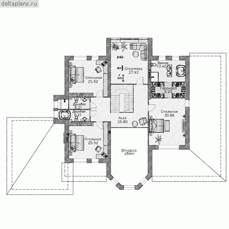 Внушительная площадь здания вмещает в себя все, что можно пожелать для комфортной загородной жизни: живописный зимний сад, двусветная гостиная с камином, спортзал. В распоряжении хозяина дома имеется кабинет. запроектирован гараж на 2 машины.