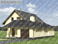 В основании дома заложен ленточный фундамент, наружные стены выполнены из керамических блоков с отделкой штукатуркой. Планировочное решение предусматривает два входа в дом: с крыльца в прихожую и с террасы в гостиную. Гостиная и столовая на первом этаже представляют собой единое пространство, где расположен угловой остеклённый эркер. Кухню возможно как изолировать перегородками, так и соединить со столовой. На первом этаже предусмотрена спальня. Встроенный гараж вмещает 1 автомобиль. На первом этаже также имеются хозяйственное помещение, кладовая, санузлы и котельная. Междуэтажная лестница расположена в пространстве холла и ведет на второй этаж, где находятся три спальни. Угловой эркер увенчан небольшим балконом. Одна из спален имеет выход также и на второй балкон.