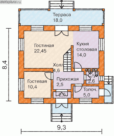 Небольшой дом с просторной террасой и балконом на мансардном этаже. На первом этаже расположена гостиная, кухня-столовая, служебные помещения и гостевая комната. На втором - три спальни, холл, ванна и туалет.