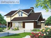 Этот компактный дом с мансардой сочетает в себе современные решения фасадов и уютную планировку. Он отличается своей функциональностью, не смотря на небольшую площадь, в нем есть все необходимое для комфортного проживания. Главный вход устроен с угла дома и через тамбур ведет в небольшую, но хорошо освещенную прихожую. Отсюда можно попасть в гостиную и смежную с ней кухню или подняться по лестнице на мансардный этаж. Гостиная освещается через большой угловой витраж, который очень эффектно смотрится на фасадах дома. Гараж и котельная изолированы и не имеют внутренней связи с другими помещениями дома, попасть в них можно с улицы. Эти помещения и часть гостиной находятся в одноэтажной пристройке. В мансарде в небольшой светлый холл-коридор выходят три спальни и ванная комната.